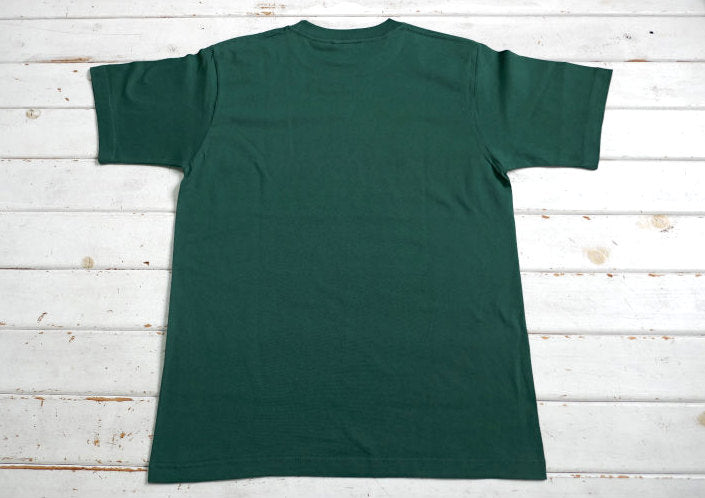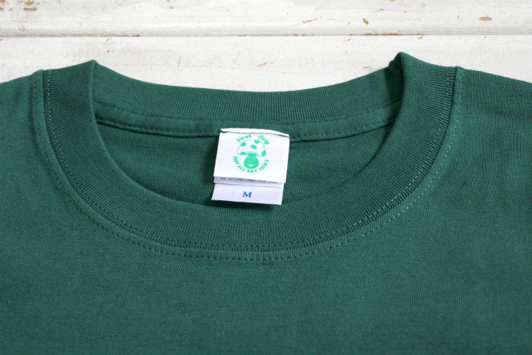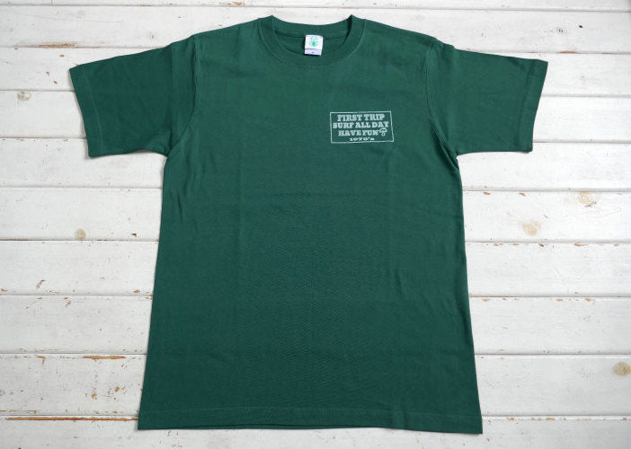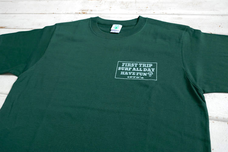 落ち着きのあるグリーンボディのフロントに【FIRST TRIP SURF ALL DAY HAVE FUN 1970's】のロゴプリント(W10.5㎝×H6.0㎝)が入っています。