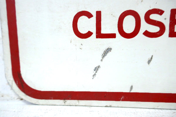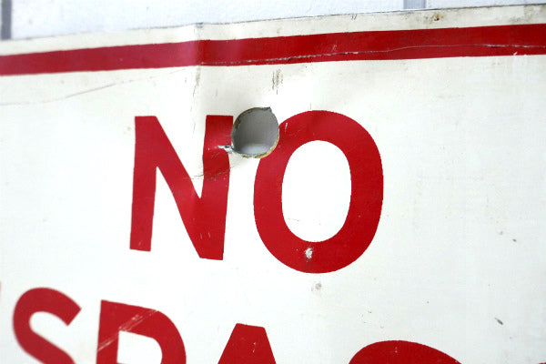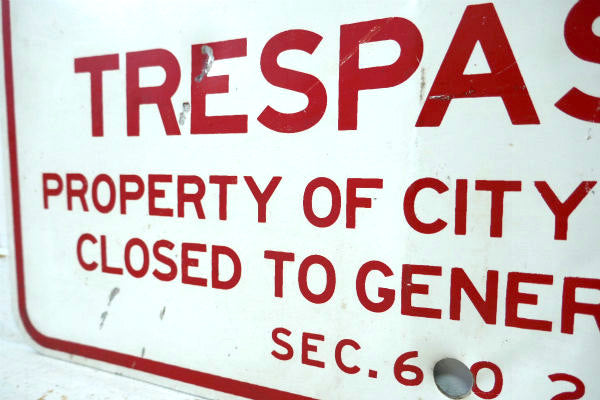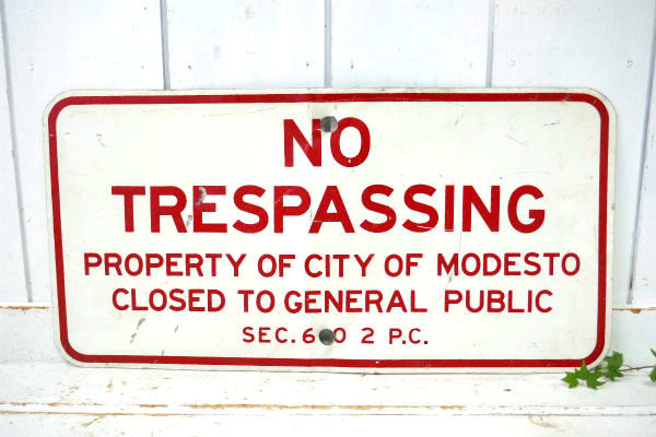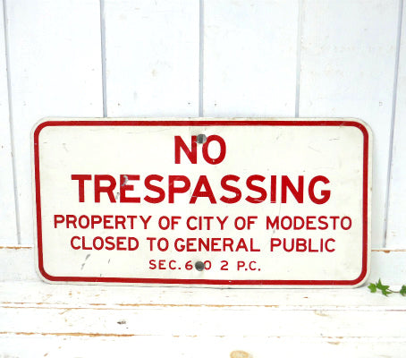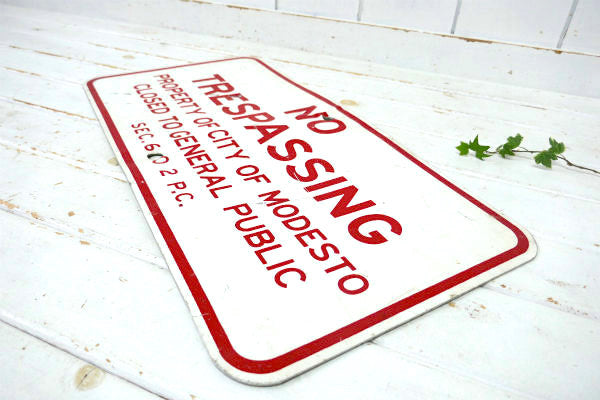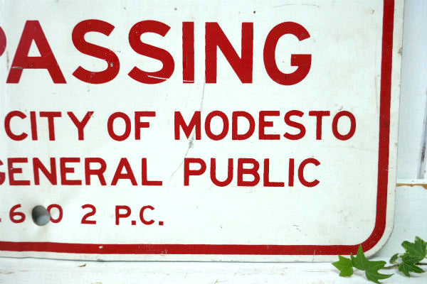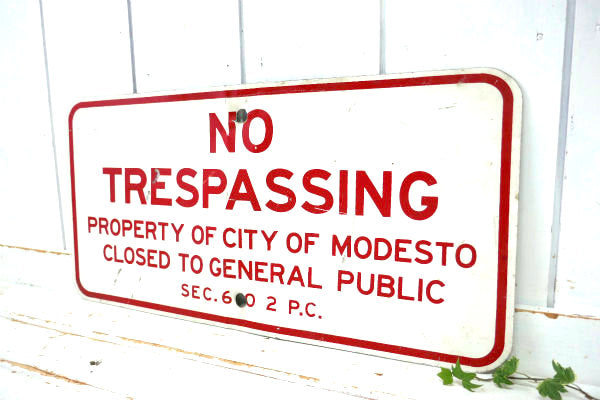 NO TRESPASSING PROPERTY OF CITY OF MODESTO CLOSEDスチール製・ヴィンテージ・サイン 立ち入り禁止・不法侵入禁止 (案内 看板)です。 実際にビル&ガレージの壁に取り付けて使われていた看板です。留め穴は2つ中央上下に一つございます。