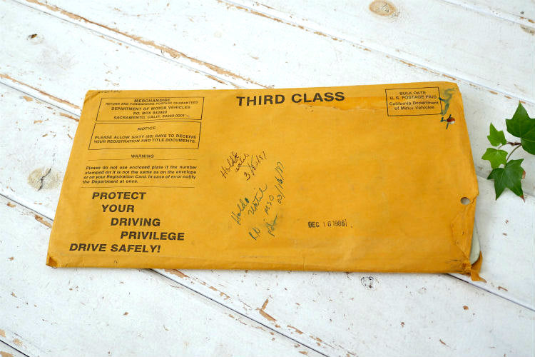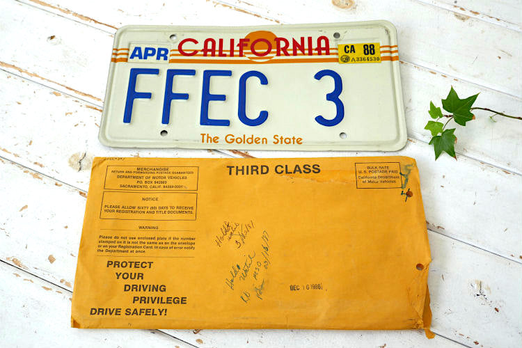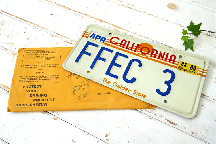 アメリカ西海岸 カリフォルニア州 ロサンゼルスで見つけました・・CALIFORNIA APR CA88 FFEC 3 The Golden State ヴィンテージ・ナンバープレート(オリジナル封筒・紙袋付き)です。