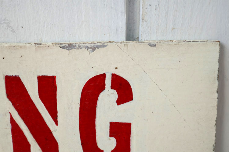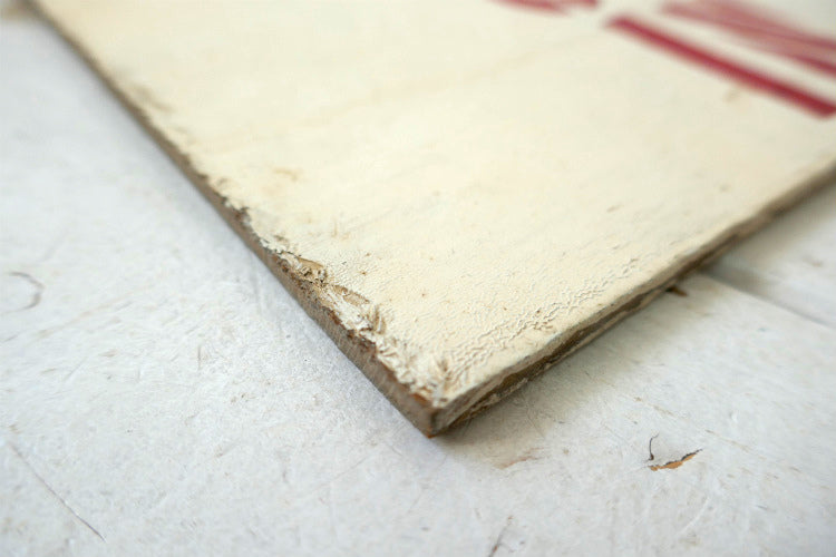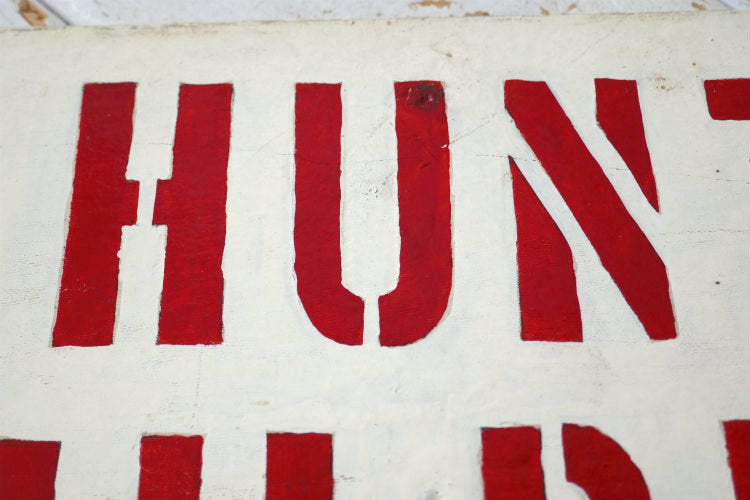 アイボリーカラーにペイントされた厚み約5㎜ウッドプレートに、【NO HUNTING CHILLDREN IN AREA(子供がいるエリアなので狩りはダメ)】の赤色 ステンシル文字がペイントされています。