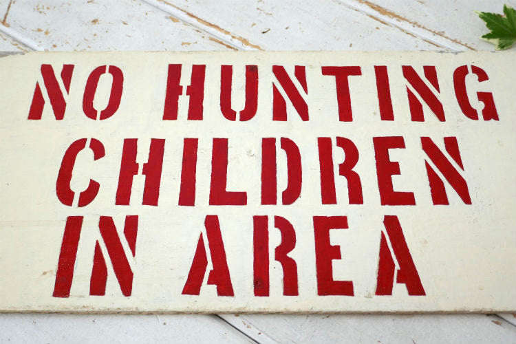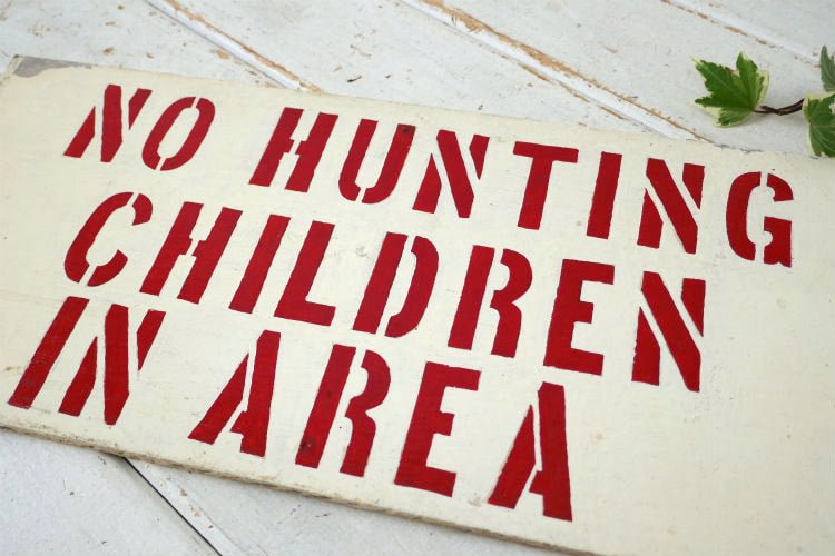 アメリカ西海岸・カリフォルニア州・ロサンゼルス郊外で見つけました・・『No Hunting Children In Area』の木製・ヴィンテージ・サインプレートです。