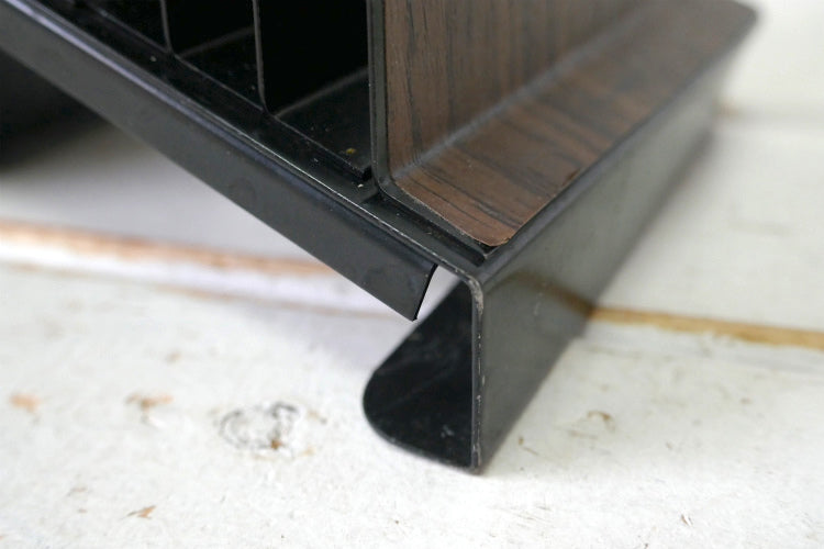 ベースはブラックカラーのメタル製、フロントとバックはウッド柄 木目柄、インダストリアルな雰囲気漂うお品です。