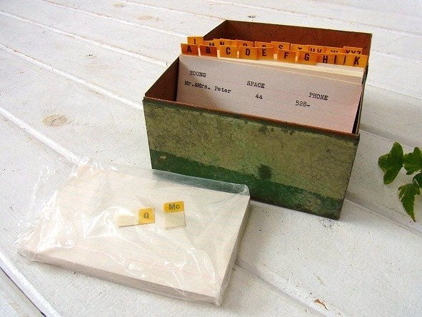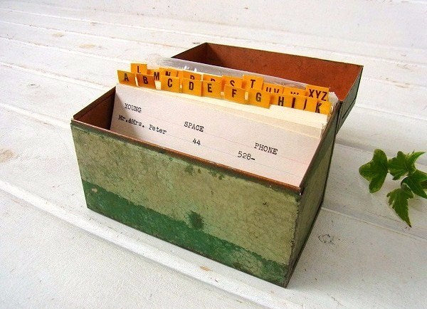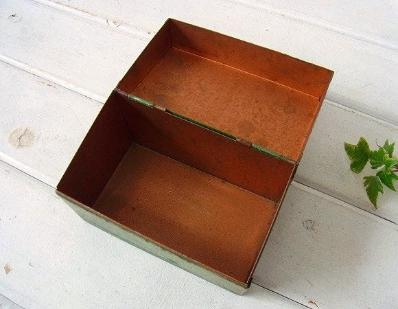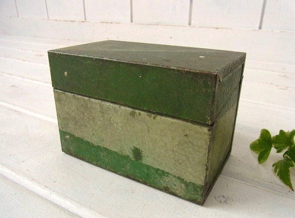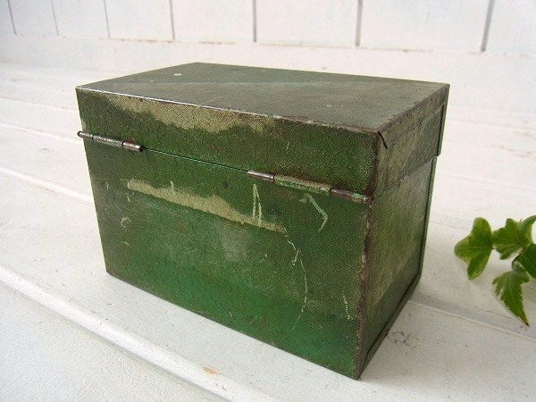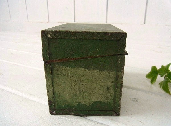 オリーブ・グリーン メタル製・カード付き・ヴィンテージ・カードボックス ファイルボックス USA