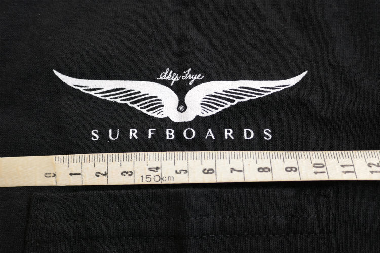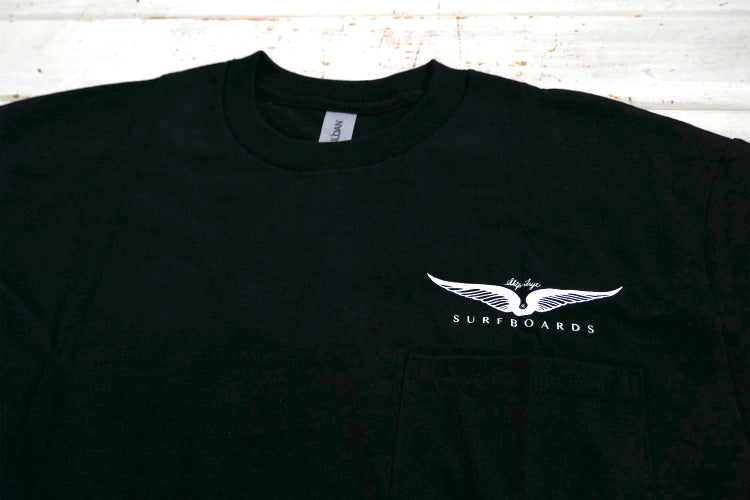 ブラックボディのフロント左胸ポケットに、ホワイトのフライウィング(Frye Wings)&【Skip Frye SURFBOARDS】、バックにブルーグラデーションのフライウィング(Frye Wings)&【Skip Frye ® SURFBOARDS】のロゴプリントが入っています。