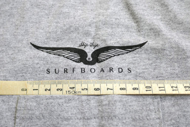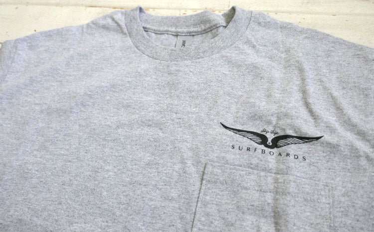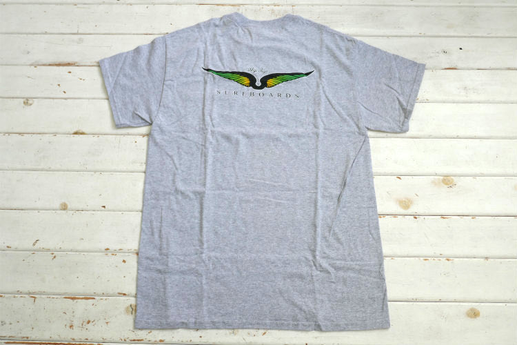 グレーボディのフロント左胸ポケットに、ブラックのフライウィング(Frye Wings)&【Skip Frye SURFBOARDS】、バックにグリーングラデーションのフライウィング(Frye Wings)&【Skip Frye ® SURFBOARDS】のロゴプリントが入っています。