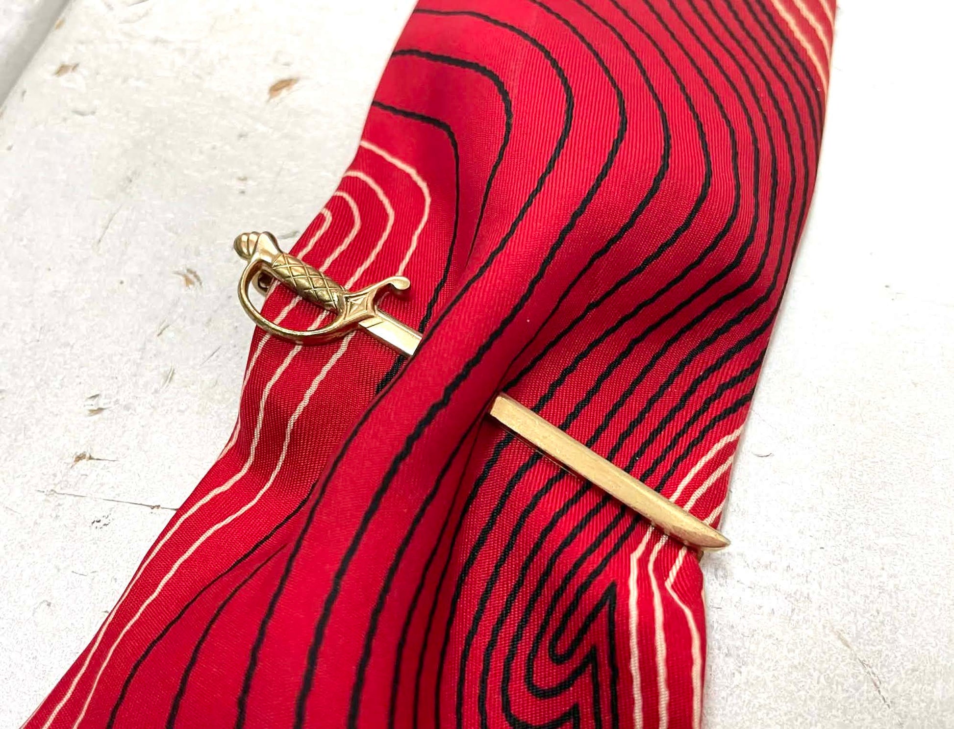剣の部分が開き、ネクタイの布を挟むタイプです。