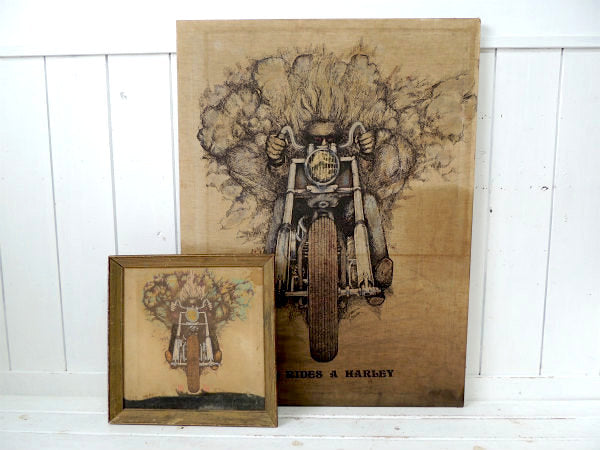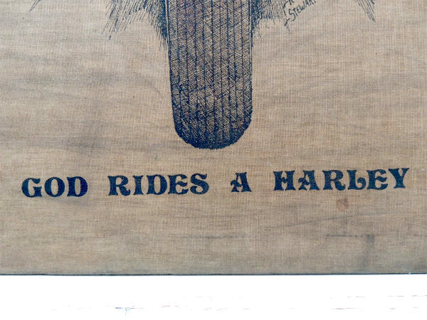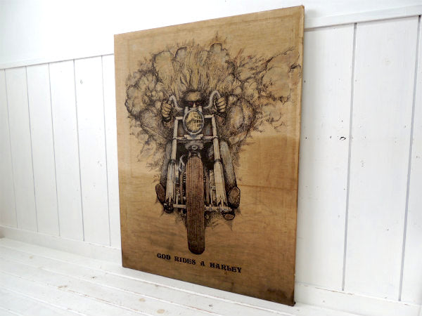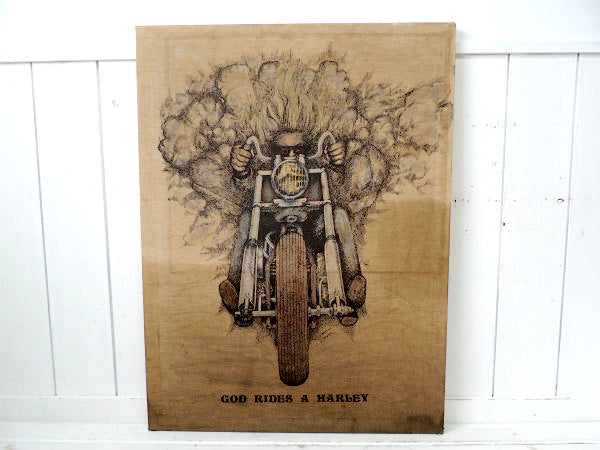 アメリカ西海岸・カリフォルニアで見つけました・・ハーレーダビッドソン "GOD RIDES A HARLEY" 木製フレームのヴィンテージ・ファブリックポスター・壁飾りです。