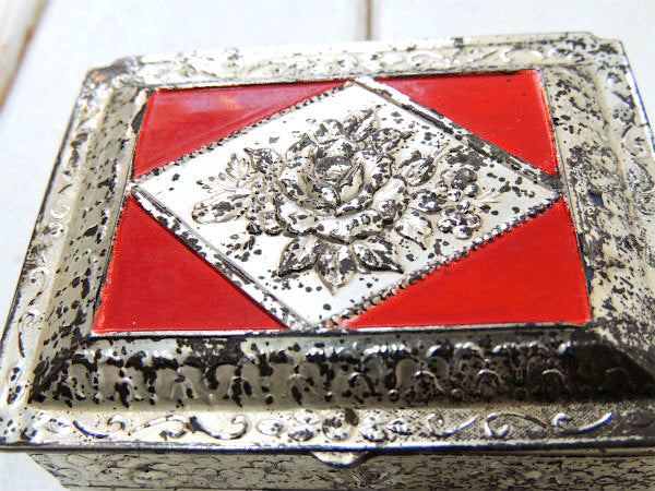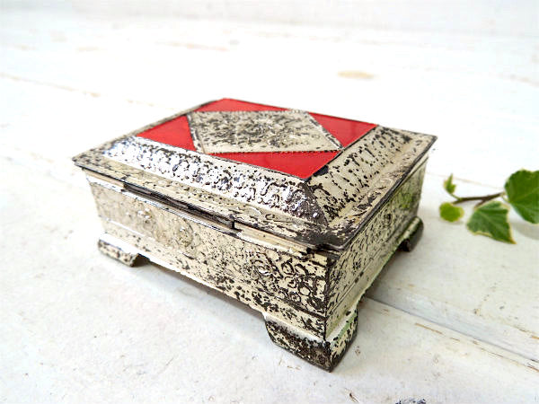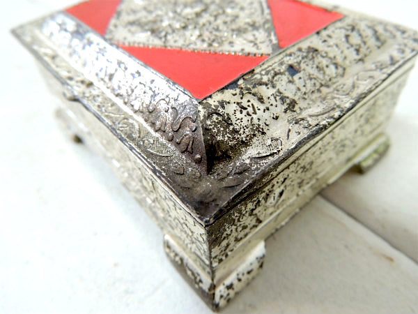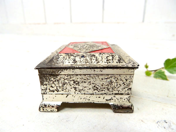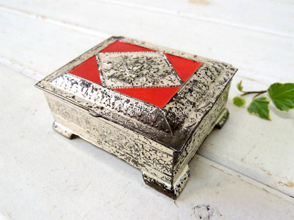アメリカで見つけました・・オキュパイド・ジャパン・脚付きシルバー色×レッドのメタル製・アンティーク・ジュエリーボックスです。