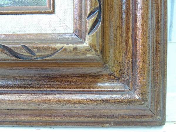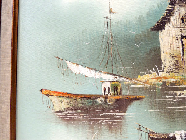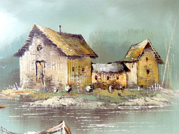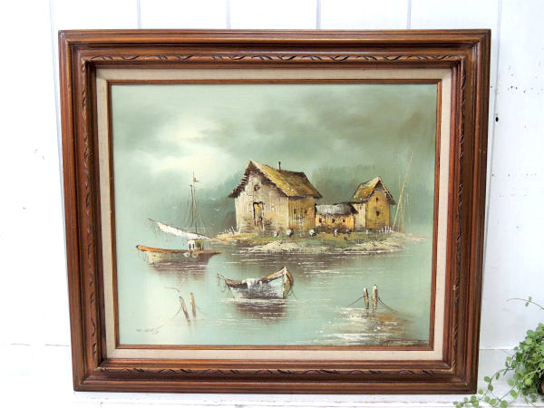 WALL ARTクラシックな雰囲気”小屋と船” 絵画・直筆サイン入りの油絵・古い木製・額縁(木製フレーム)です。