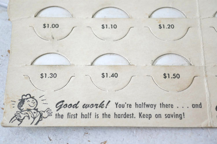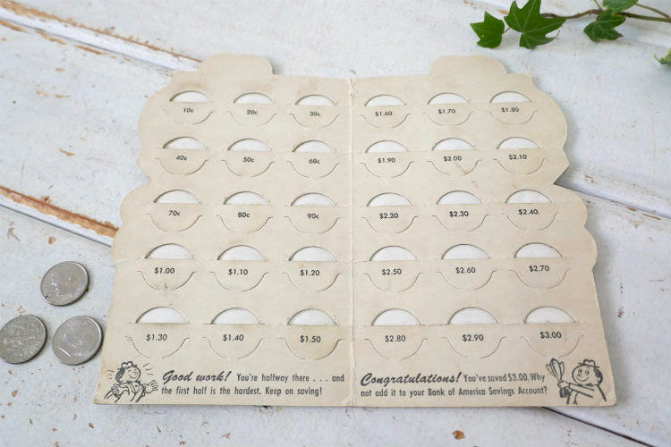 左半分の$1.50に、『よくやった!あと半分。そして前半が一番難しい。節約を続けてね!』、右半分の$3.00に『おめでとう!3ドル節約できました。バンクオブアメリカの普通預金口座に追加してください!』とございます。