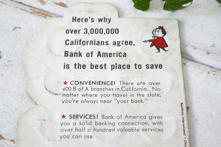 背面に『Here's why over 3,000,000 California agree, Bank of America is the best place to save(その理由は以下、300万円人以上のカリフォルニア州民もそう思う、ババンクオブアメリカ が貯蓄に最適である理由です)』など、BANK OF AMERICAのセールスポイントやサービス内容がたくさん記載されています。