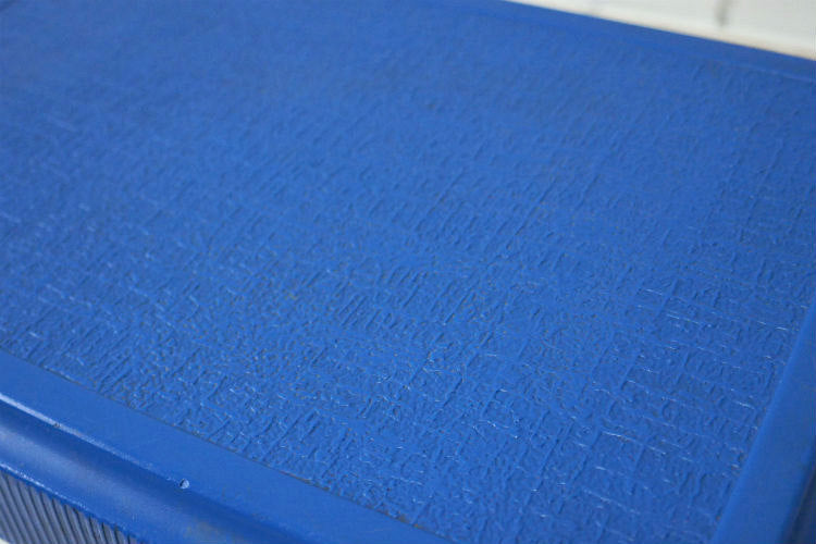 カラーはブルー×ホワイト、蓋には細やかなエンボス模様が施されており、ボディ下部に細かなストライプデザインが入っています。