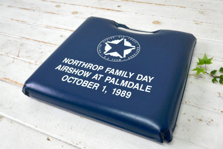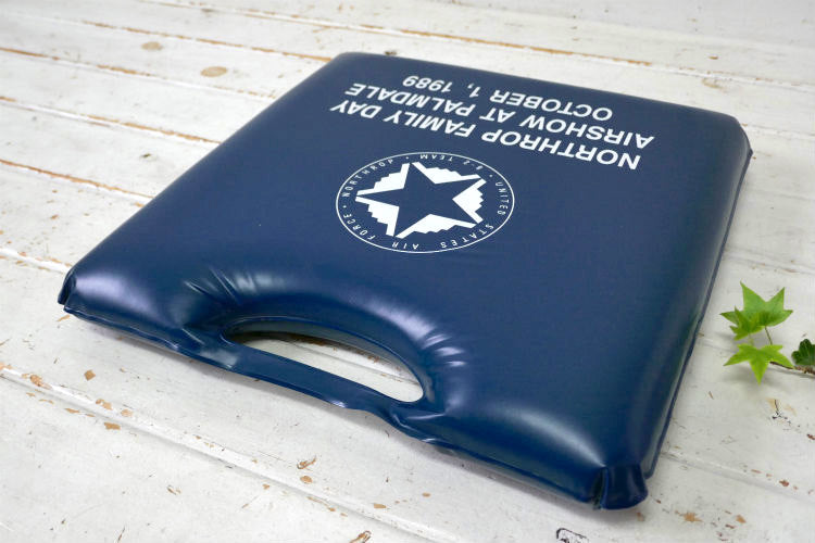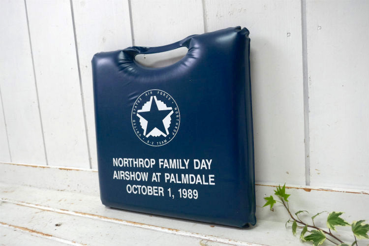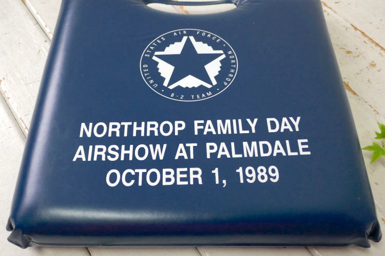 ネイビーカラーのビニール製クッションに、【★UNITED STATES AIR FORCE★NORTHROP★B-2 TEAM】【NORTHROP FAMILY DAY AIRSHOW AT PALMDALE OCTOBER 1, 1989】のプリントが入っています。