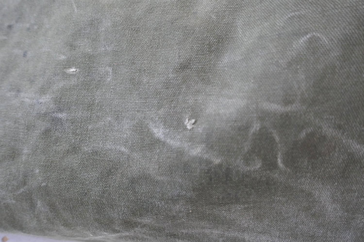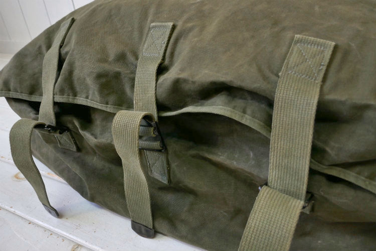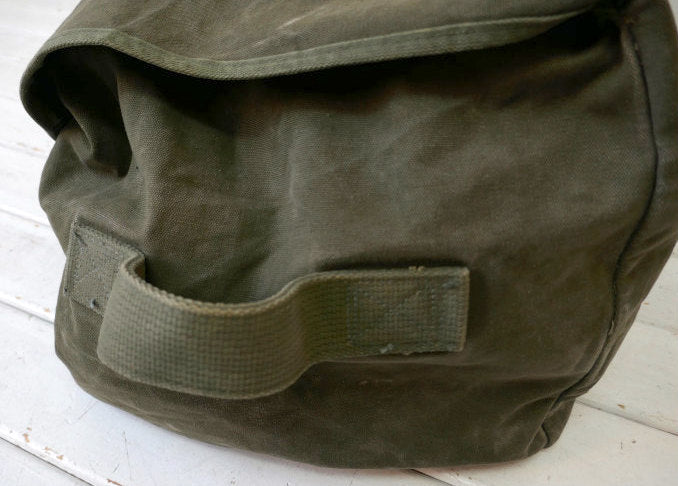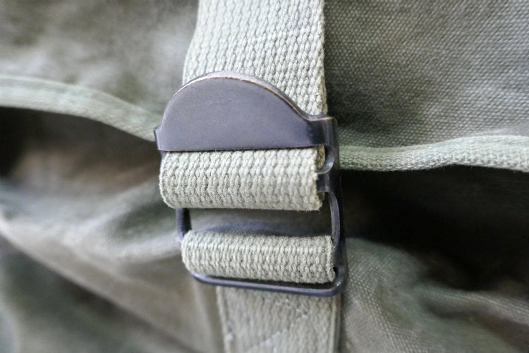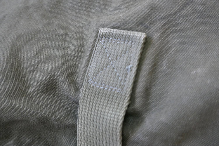カラーはオリーブグリーン、材質は丈夫な造りのコットンキャンバス素材、内側を留めるストラップが1箇所、外側カバーを留めるストラップが3箇所ございます。