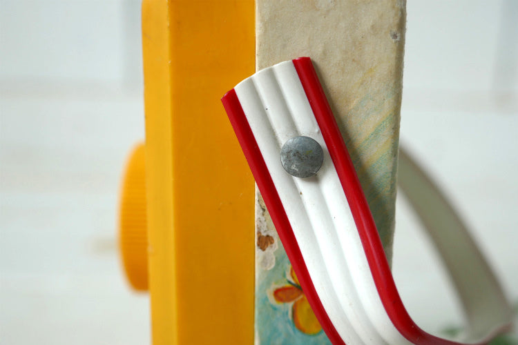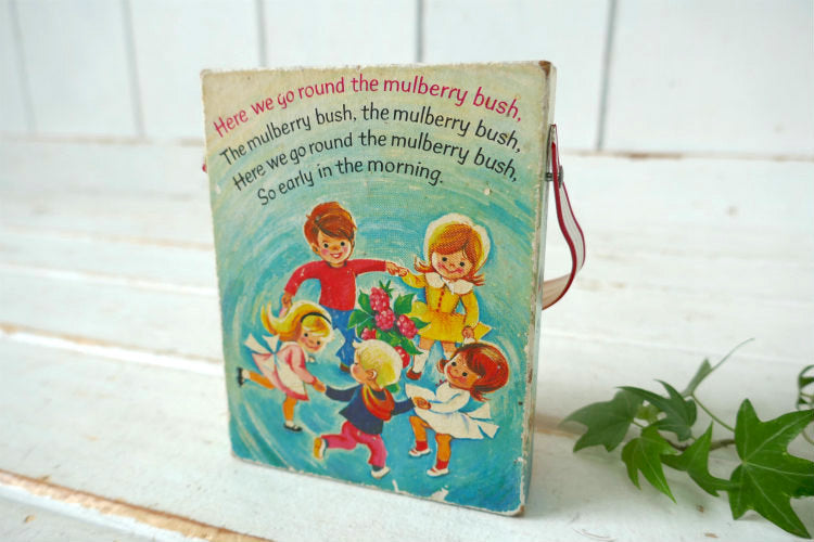 中央のツマミを右に回すとイギリス童謡の【Here we go round the mulberry bush(桑の木の周りを回ろう)】のオルゴール(曲)が流れ、小窓の中のイラストも回ります。