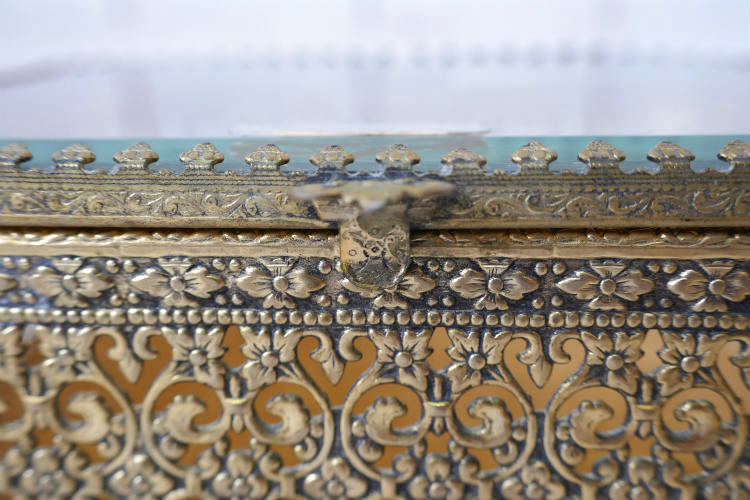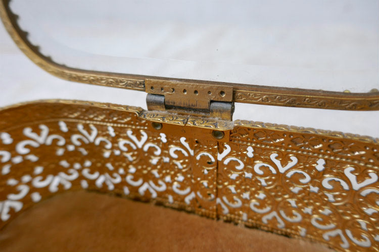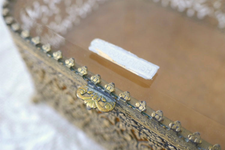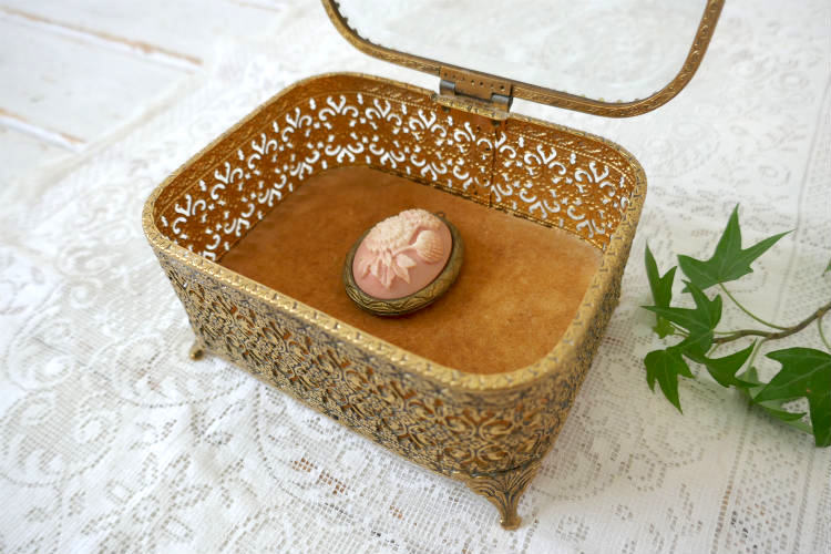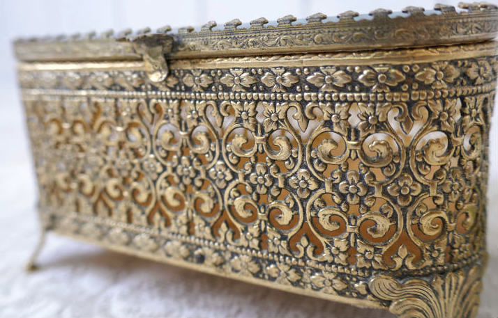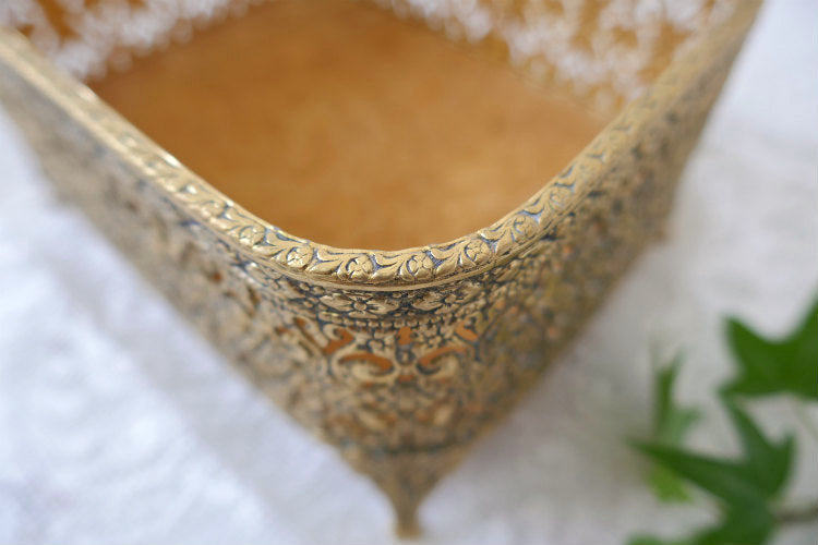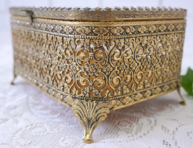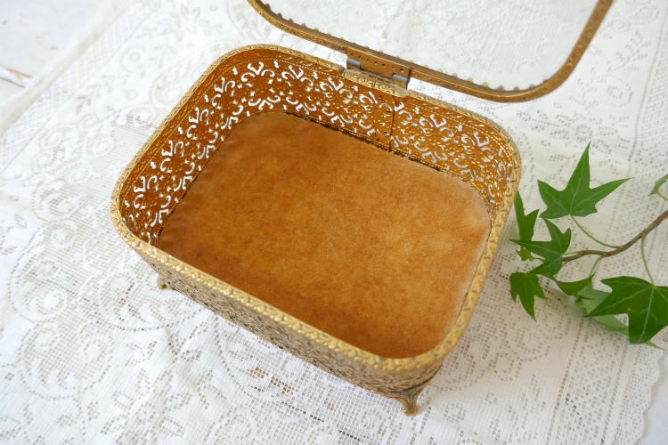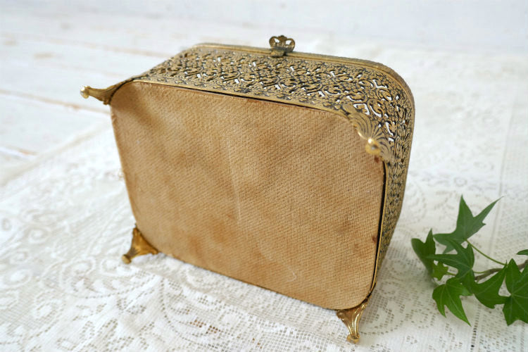 アメリカ西海岸・カリフォルニア州・ロサンゼルスで見つけました・・24金ゴールドプレート(純金メッキ)製のアンティーク・脚付きジュエリーボックスです。
