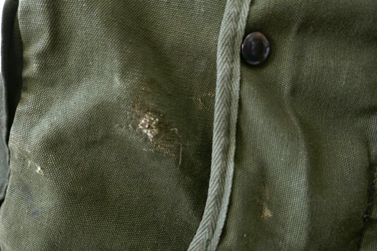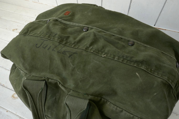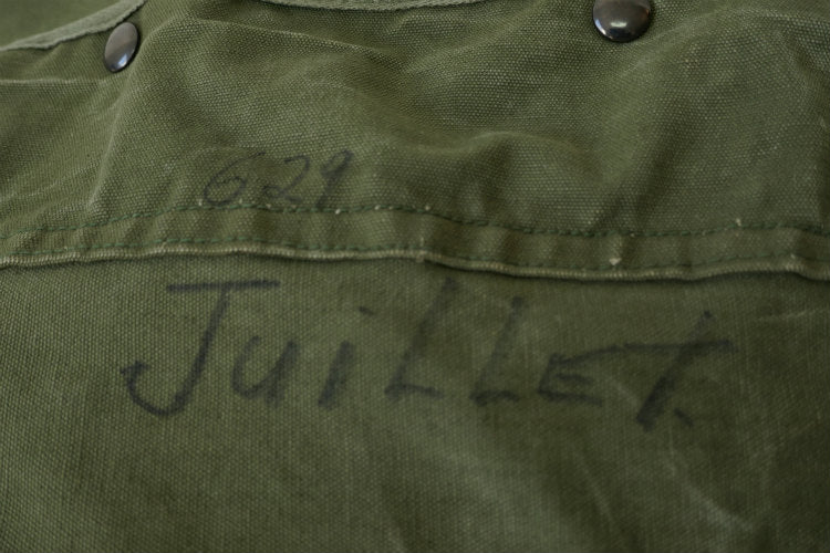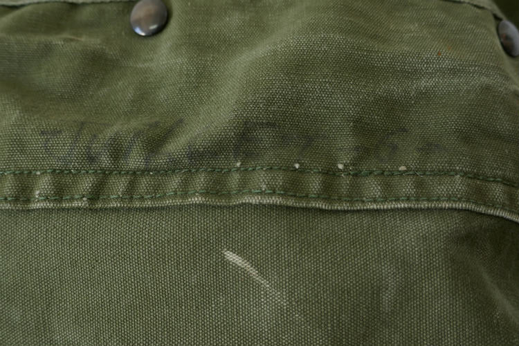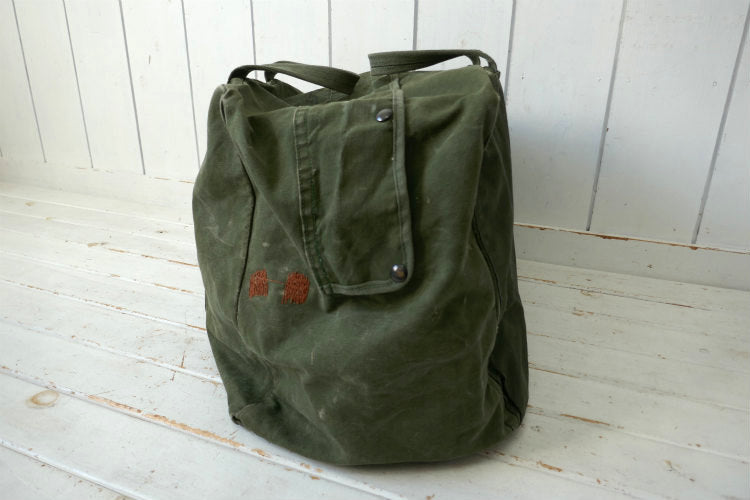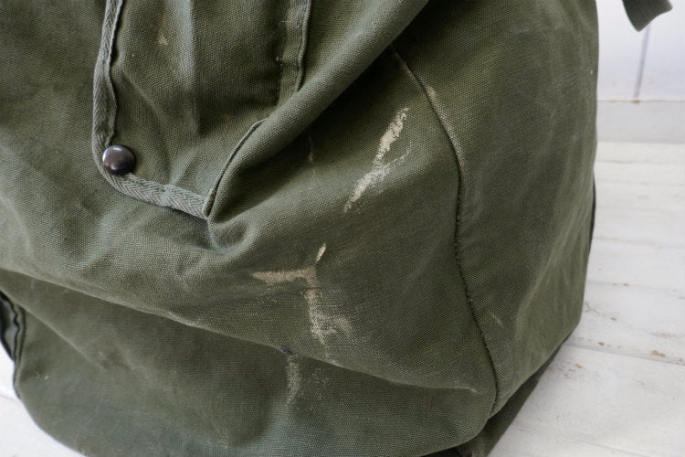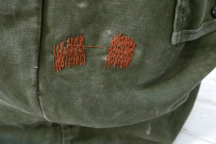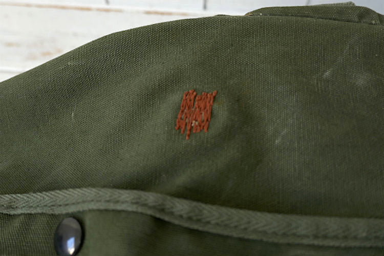 カラーはオリーブグリーン、材質は丈夫な造りのコットンキャンバス素材で、片面は同色の生地で全面補修されております。