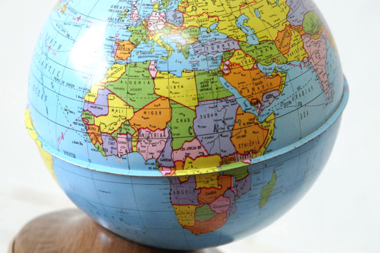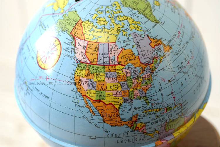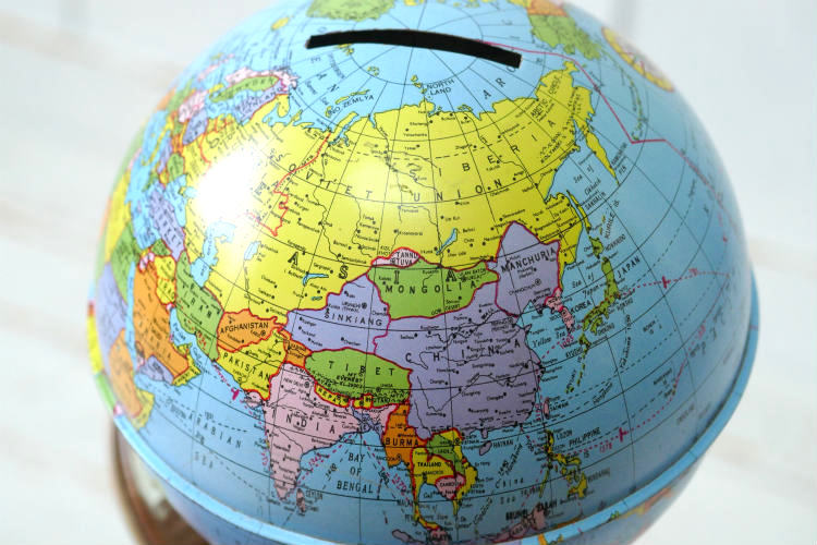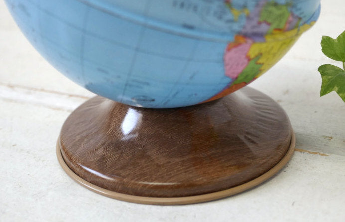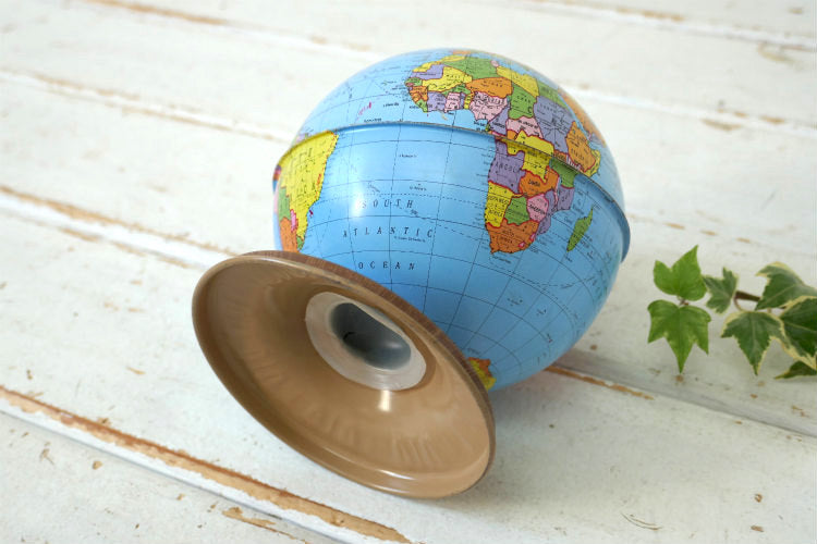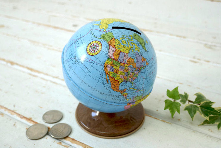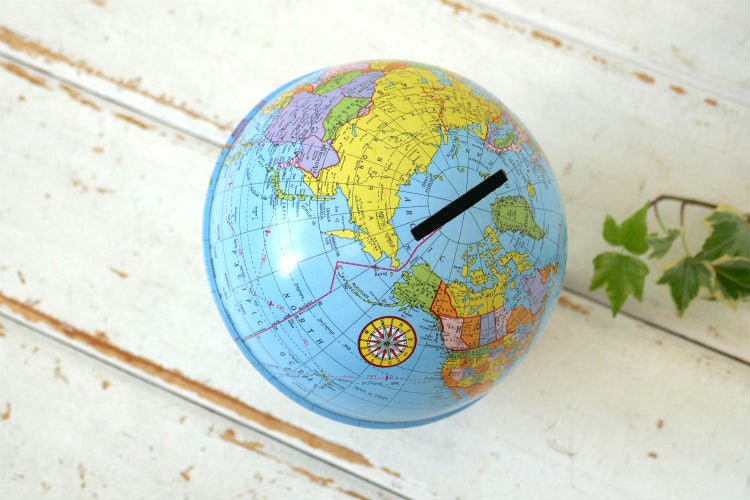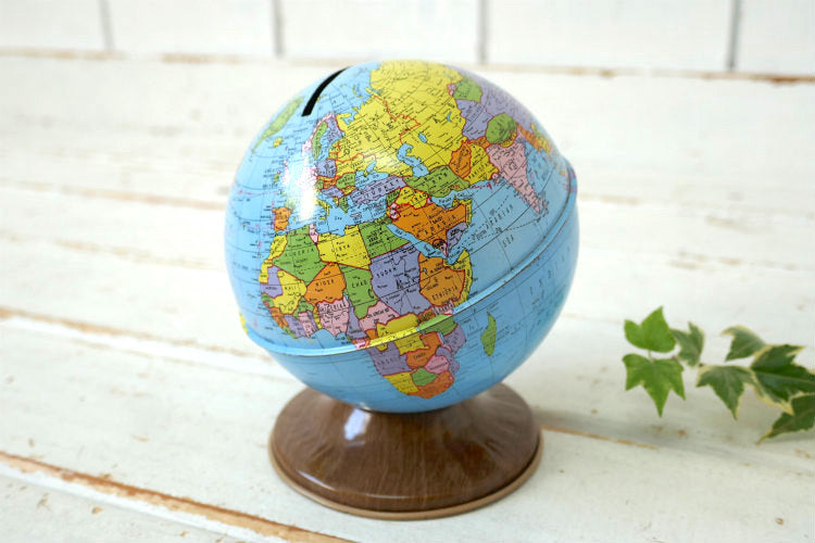 アメリカ西海岸 カリフォルニア州 ロサンゼルスで見つけました・・『オハイオアート(THE OHIO ART CO.)社』の地球儀型・ティン製・ヴィンテージ・コインバンク(貯金箱)です。