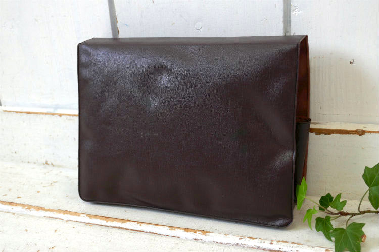 ブラウンカラーのレザー柄ビニール製ケースのカバーにフック穴があり、バスルームやパウダールームの壁に掛けて使用できます。
