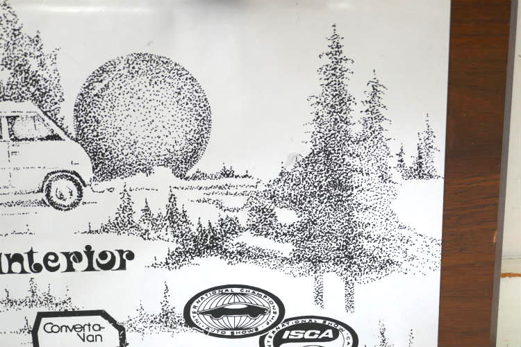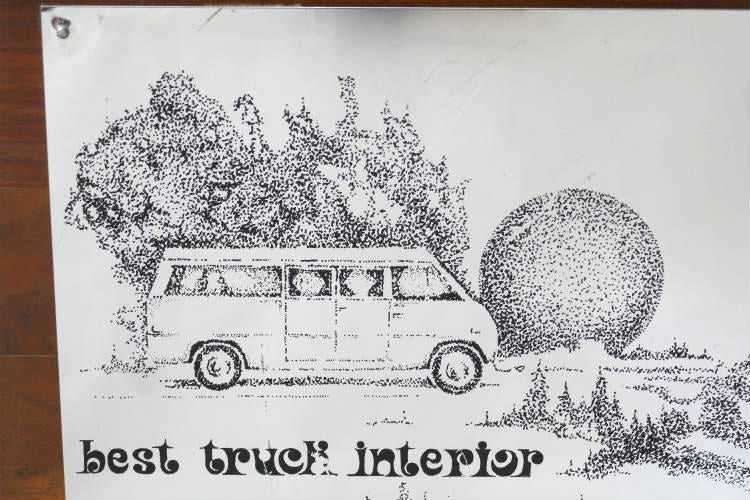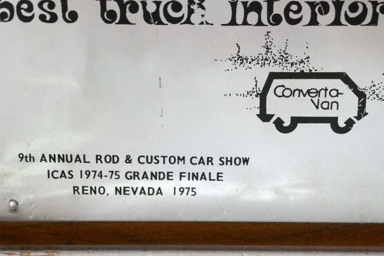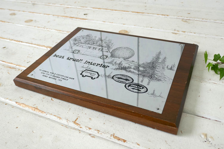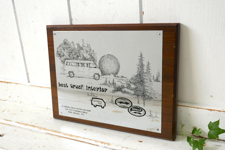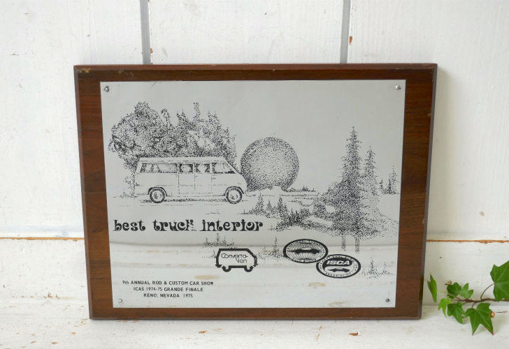 厚みのあるしっかりとした木製ボードに、アメ車バン&木々の風景のイラスト&【best truck interior】【Converta-Van】【9th ANNUAL ROD & CUSTOM CAR SHOW ICAS 1974-1975 GRANDE FINALE RENO, NEVADA 1975】【INTERNATIONAL CHAMPIONSHIP AUTO SHOWS】【INTERNATIONAL SHOW CAR ASSOCIATION / ISCA】のクールなプリントが入ったミラーパネルが付いています。