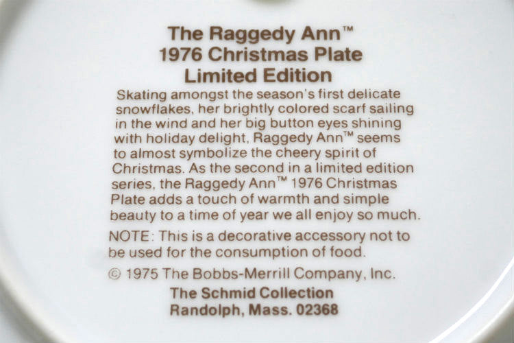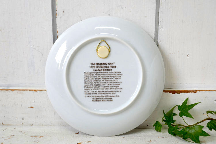 背面に【The Raggedy Ann 1976 Christmas Plate Limited Edition】【NOTE: This is a decorative accessory not yo be used for the consumption of food(これは装飾品で、食べ物を食べる為に使用する物ではありません)】【©1975 The Bobbs-Merrill Company , Inc. The Schmid Collection Randolph, Mass. 02368】とございます。