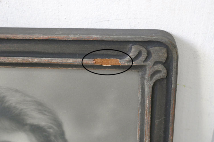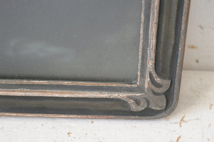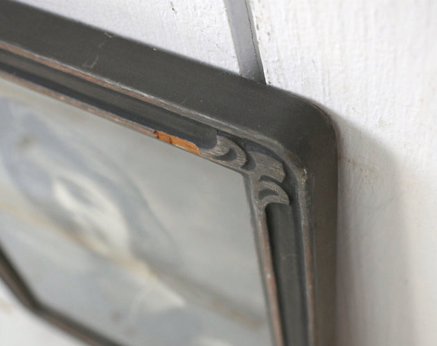 シルバーグレーにペイントされた丸みのある木製の縁に四つ角に、リーフ柄のエンボス模様が手彫りで施された、素敵なアールヌーヴォーデザインです。
