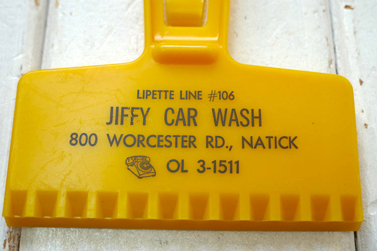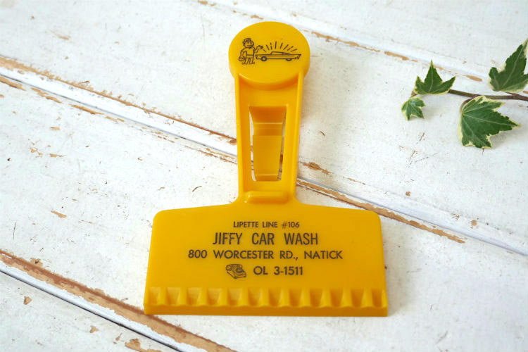 ヘラ部分に【LIPTTE LINE #106 JIFFY CAR WASH 800 WORCESTER RD., NATICK OL 3-1511】、ハンドル先には洗車をした男性が『見てください!』と満足げにピカピカになった車を紹介しているユニークなプリントが入っています。